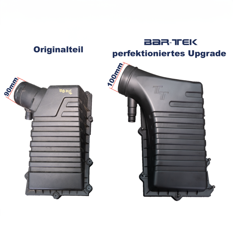Aumenta l'afflusso d'aria e le prestazioni del tuo motore 2.5 TFSI con la nostra scatola filtro aria potenziata! La nostra scatola filtro aria potenziata offre quasi 1000 cm³ di volume in più rispetto alla versione standard, sviluppata appositamente per ottimizzare l'afflusso d'aria al motore. Questo design garantisce un flusso d'aria ottimale per fornire al motore la quantità d'aria ideale e aumentare significativamente l'efficienza. A differenza della scatola filtro aria standard, la geometria del flusso della nostra scatola filtro aria potenziata è progettata per adattarsi alle prestazioni del tuo motore. Ciò significa che non perderai più potenza preziosa, ma potrai godere di prestazioni ottimali. Realizzata con materiali di alta qualità, la nostra scatola filtro aria favorisce una messa a punto sostenibile ed è facile da installare, adattandosi perfettamente al tuo veicolo. Oltre al filtro aria stesso, anche la scatola filtro aria svolge un ruolo diretto nelle prestazioni del tuo motore. Il filtro aria purifica l'aria di aspirazione da sporco e particelle di polvere per garantire una miscela aria-carburante ottimale, che a sua volta è importante per prestazioni costanti. Una combustione efficiente richiede un flusso d'aria ottimale, garantito dalla nostra scatola filtro aria potenziata. Un flusso d'aria limitato porta a perdite di potenza e a un funzionamento inefficiente del motore. Il nostro upgrade elimina completamente questo problema. Oltre alla scatola del filtro dell'aria, ti consigliamo di aggiornare anche il filtro dell'aria stesso per sfruttare appieno il potenziale delle prestazioni e ottimizzare la tua esperienza di guida! Aspirazione originale circa 90 mm. Upgrade BAR-TEK 100 mm (4 pollici) o 127 mm (5 pollici) Volume: Originale: circa 3500 cm³ Upgrade BAR-TEK: circa 4500 cm³ Informazioni sul produttore sul produttore BAR-TEK BAR-TEK Motorsport GmbH Im Rauschen Auel 3, 51491 Overath-Brombach, Germania info@bar-tek.com 2.5 TFSI (EA855 evo) | DNWA | 400 hp (294 kW) 2.5 TFSI (EA855 evo) | DNWB | 390 HP (287 kW) 2.5 TFSI (EA855 evo) | CZGB | 367 hp (270 kW) 2.5 TFSI (EA855 evo) | DAZA | 400 hp (294 kW) 2.5 TFSI (EA855 evo) | DNWA | 400 hp (294 kW) 2.5 TFSI (EA855 evo) | DXHB | 400 hp (294 kW) 2.5 TFSI (EA855 evo) | DNWC | 400 hp (294 kW) 2.5 TFSI (EA855 evo) | DNWD | 407 PS (299 kW) 2.5 TFSI (EA855 evo) | DNWA | 400 hp (294 kW) 2.5 TFSI (EA855 evo) | CZGB | 367 hp (270 kW) 2.5 TFSI (EA855 evo) | DAZA | 400 hp (294 kW) 2.5 TFSI (EA855 evo) | DNWC | 400 hp (294 kW) 2.5 TFSI (EA855 evo) | DNWA | 400 hp (294 kW)