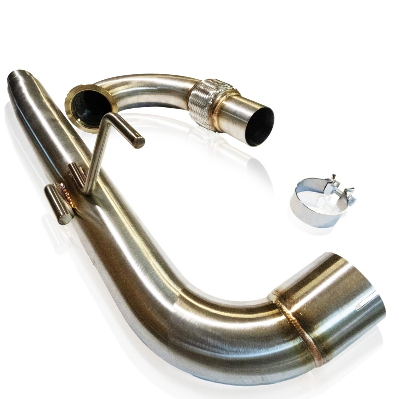 Due to the ø 76 mm downpipe completely without catalyst, the back pressure is significantly reduced and the turbo is relieved. This brings more power and less exhaust gas temperature. The downpipe is made of stainless steel. The flanges are laser cut from steel so that they do not warp. The flange surfaces are planned in the connection and prevent thus leakages. We use here an interlock flex pipe, which is particularly flexible and also very stable. Two lambda probe connections in M18x1,5 mm are welded in. The connecting pipe to the exhaust is reduced to 60 mm and can therefore be easily driven with the original exhaust system. Possibly the after cat probe must be programmed out in the software. Only suitable for vehicles with front wheel drive. Manufacturer Information about the manufacturer BAR-TEK BAR-TEK Motorsport GmbH Im Rauschen Auel 3, 51491 Overath-Brombach, Germany info@bar-tek.com