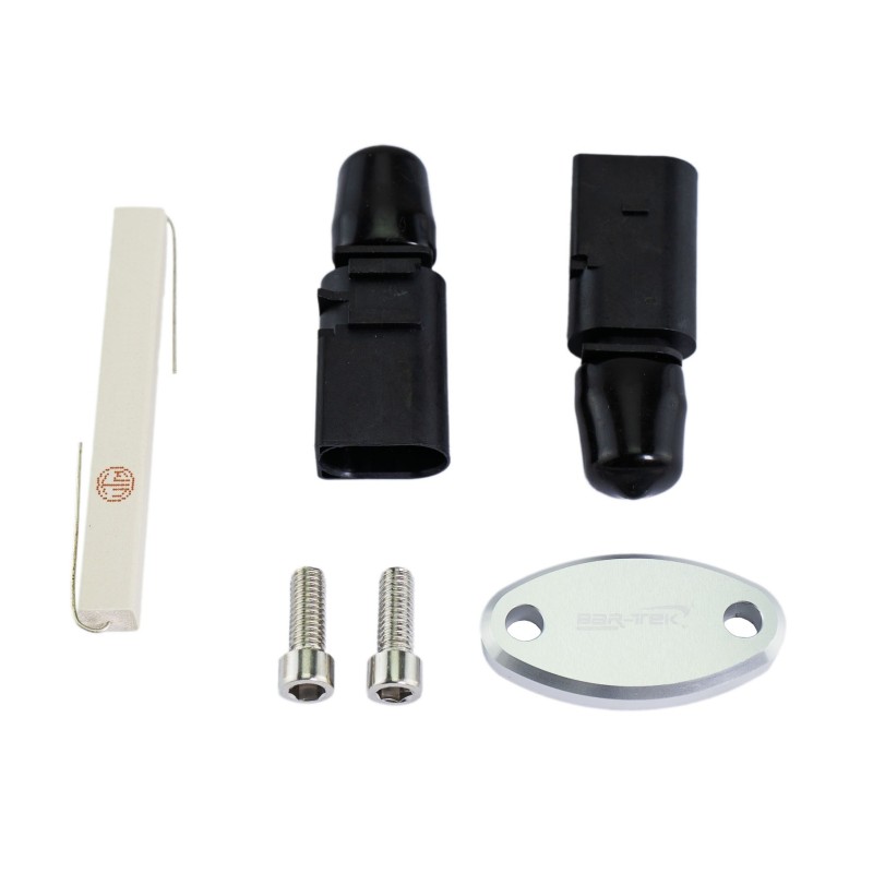 Plug & Play kit for all 1.8T and all other Audi and VW engines for removing the secondary pump (kill kit). 1x resistor for secondary pump 2x oval adapter plugs for control valves 1x sealing plate for cylinder head (with O-ring and VA screws) With this kit, the complete secondary unit can be removed from your 1.8T engine. Control unit no longer displays error codes! On some vehicles, the secondary air pump may also have to be programmed in the ECU. Installation: Remove the secondary air pump. The resistor must simply be soldered into the wiring harness that leads to the secondary pump. The resistor effectively replaces the secondary pump so that the engine control unit does not report an error. Completely remove the EGR valve at cylinder head. Close the open channel on the cylinder head with our aluminium sealing plate. Connect the hose from the blow off valve (SUV or also called blow-off) directly to the intake manifold. Now two solenoid valves without function remain. Simply replace these valves with our two adapter plugs. Depending on the engine code, these valves are located under the intake manifold or on the valve cover. However, it is easy to find these valves as it is self-explanatory if you follow this sequence. (subject to registration) Manufacturer Information about the manufacturer BAR-TEK BAR-TEK Motorsport GmbH Im Rauschen Auel 3, 51491 Overath-Brombach, Germany info@bar-tek.com