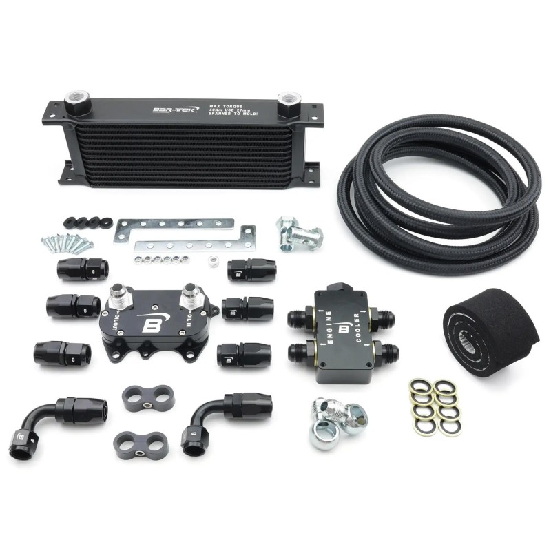 First oil cooler kit on the market, specifically for the 1.6L & 2.0L TDI engines up to 2013, as installed in many VAG vehicles. Already from the factory, the TDI engines struggle with high oil temperatures. If you are then still on the road in high summer or your vehicle is performance optimized, temperatures of 140 ° C are not uncommon. Our oil cooler flange connects the engine to the oil cooler kit. The oil cooler kit prevents high oil temperatures, ensuring constant oil pressure and optimal oil consistency. This positively affects the life of your TDI engine. BAR-TEK complete kit: coated 13 row high performance oil cooler Special BILLET flange for connection to the engine block external thermostat (opens at approx. 90-95°C) 3 meters of nylon-coated high-pressure piping in Dash 8 Complete gasket and mounting material 2X vibration dampers This kit not only impresses with its easy installation, but also provides constant oil temperature and oil pressure control. The nylon coated lines are durable, weather resistant and provide long life and optimum flow. We recommend to use our special TDI oil! Suitable for many 1.6L & 2.0L TDI engines in VW, Audi, Seat and Skoda. Picture similar Manufacturer Information about the manufacturer BAR-TEK BAR-TEK Motorsport GmbH Im Rauschen Auel 3, 51491 Overath-Brombach, Germany info@bar-tek.com